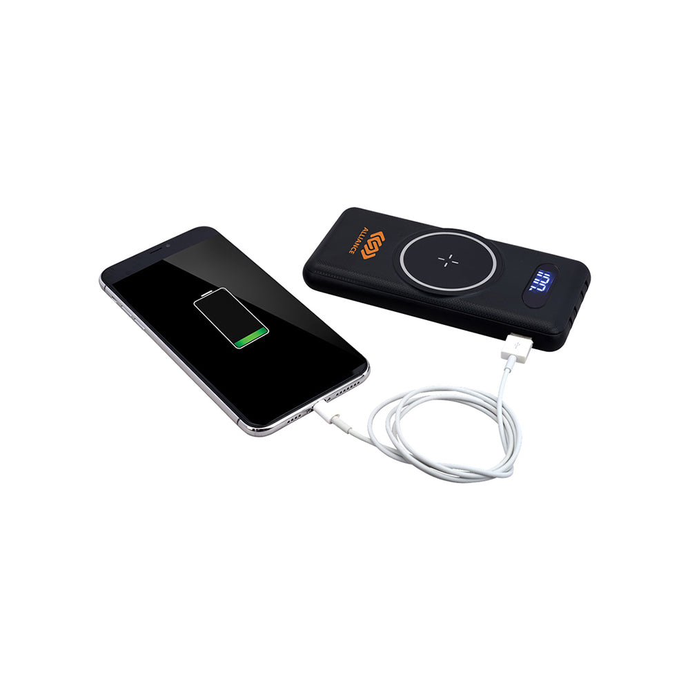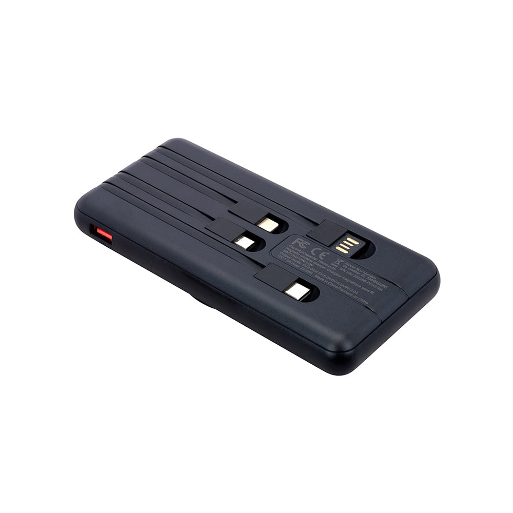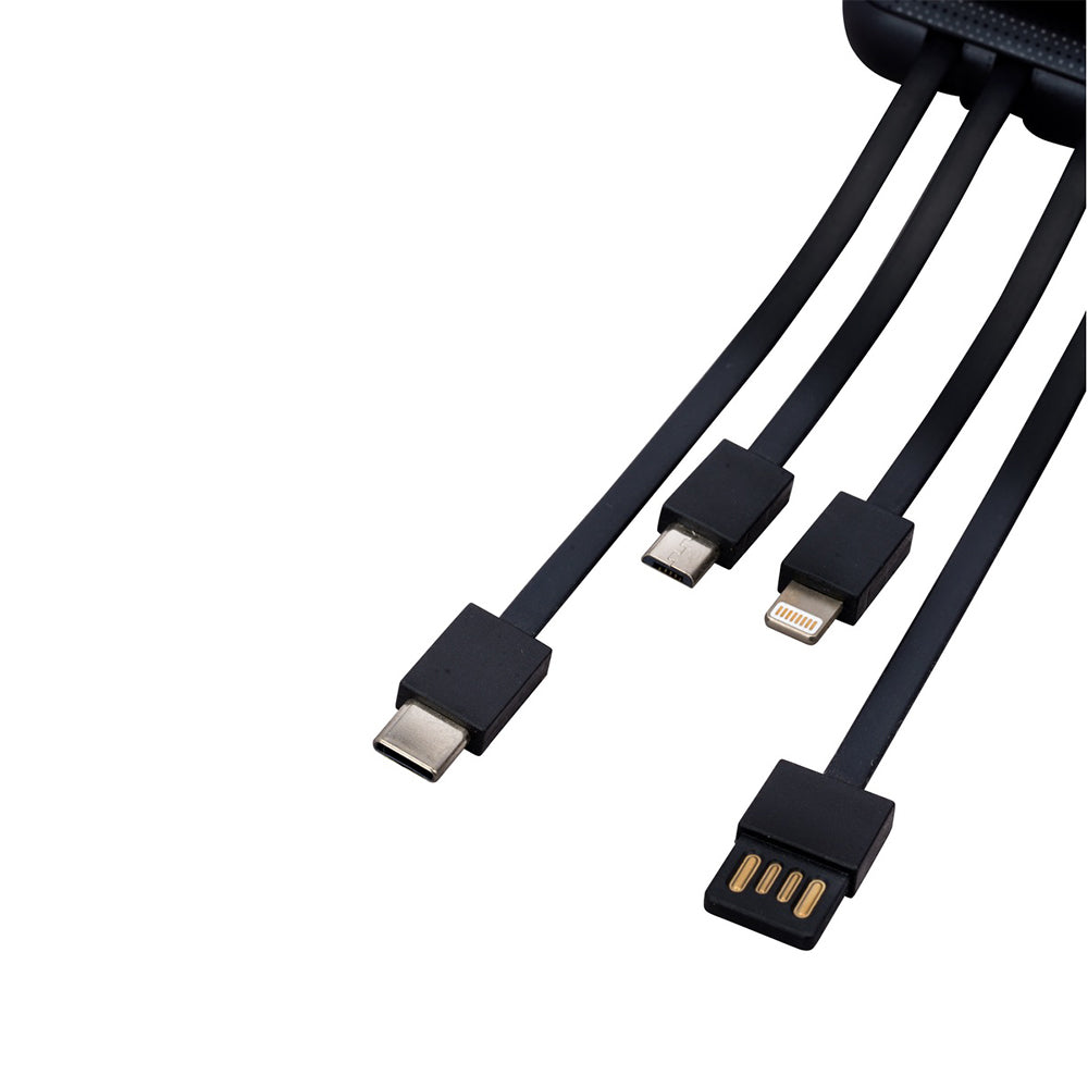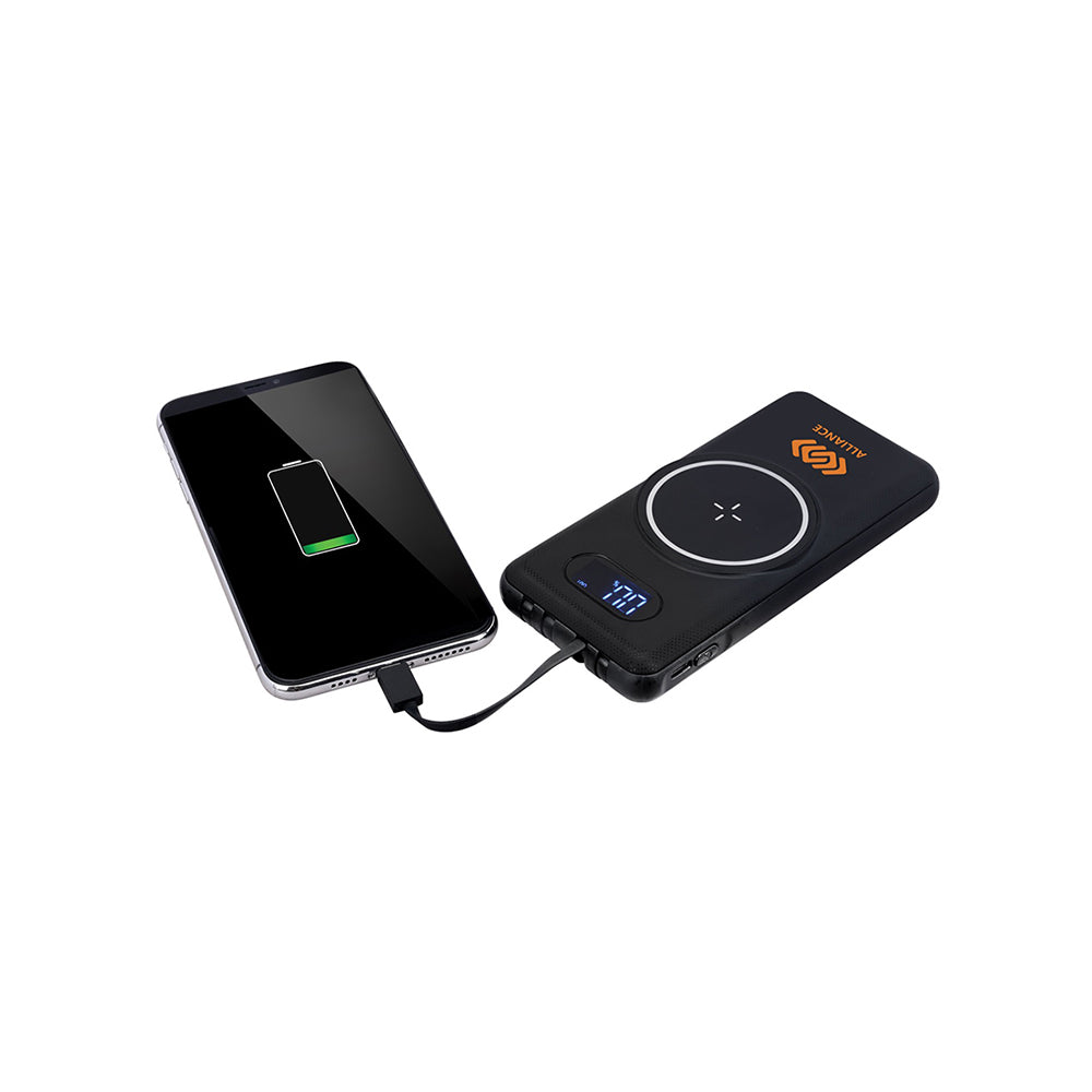 Magnetic, wireless charging surface holds your device. Features 4 different built-in cables for device charging: Type-C, lightning, micro-USB, and USB. Power bank capacity: 10,000 mAh. Wireless Output: up to 15W. ype-C Input: 5V/3A, 9V/2A, 12V/1.5A and USB Input: 5V/2. Approx power bank recharge time: 3 - 5 hours.