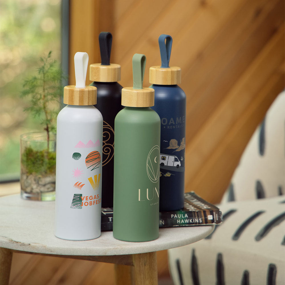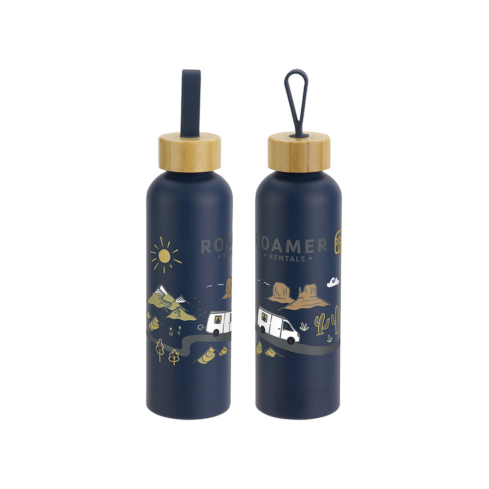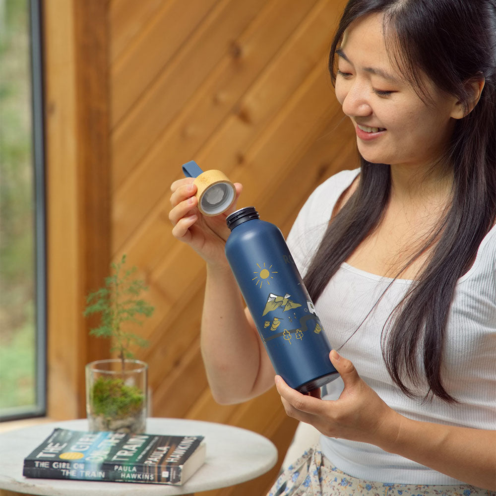 Constructed from GRS certified recycled aluminum. Single-wall aluminum construction. Bamboo screw-on cap with finger loop.