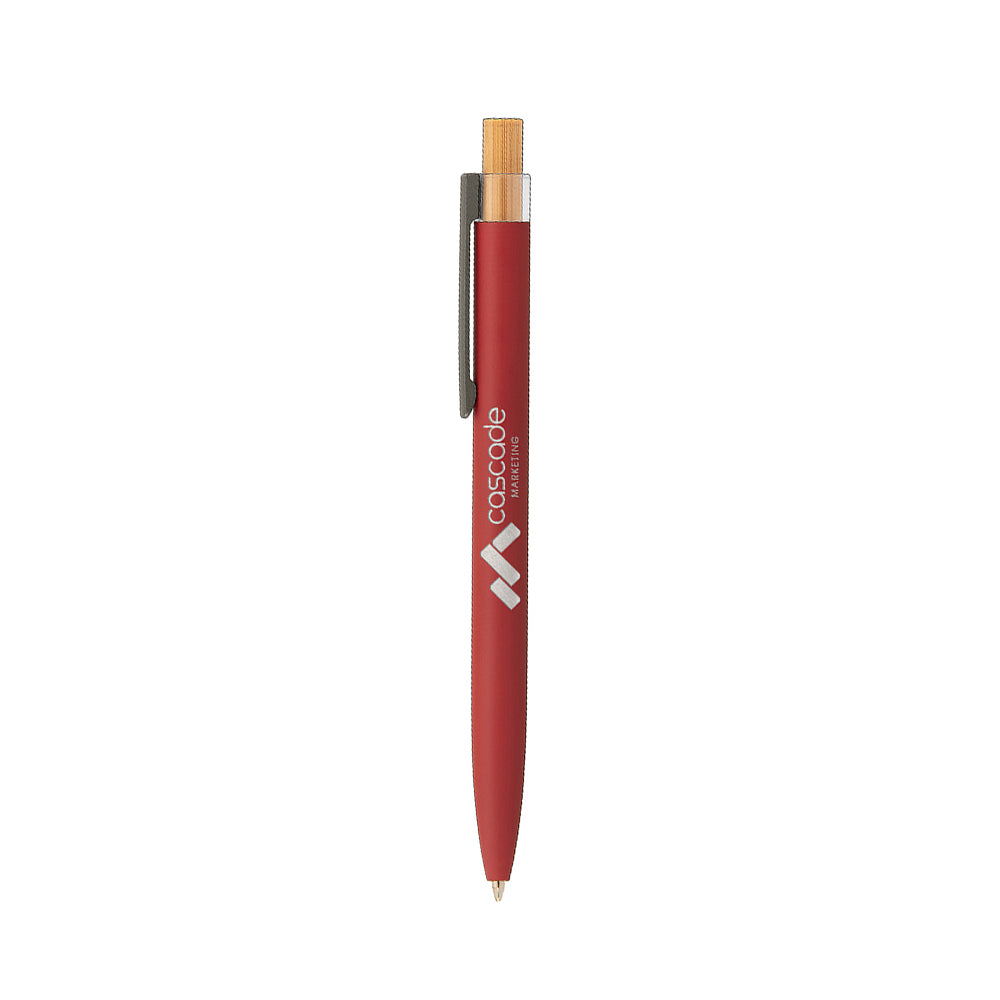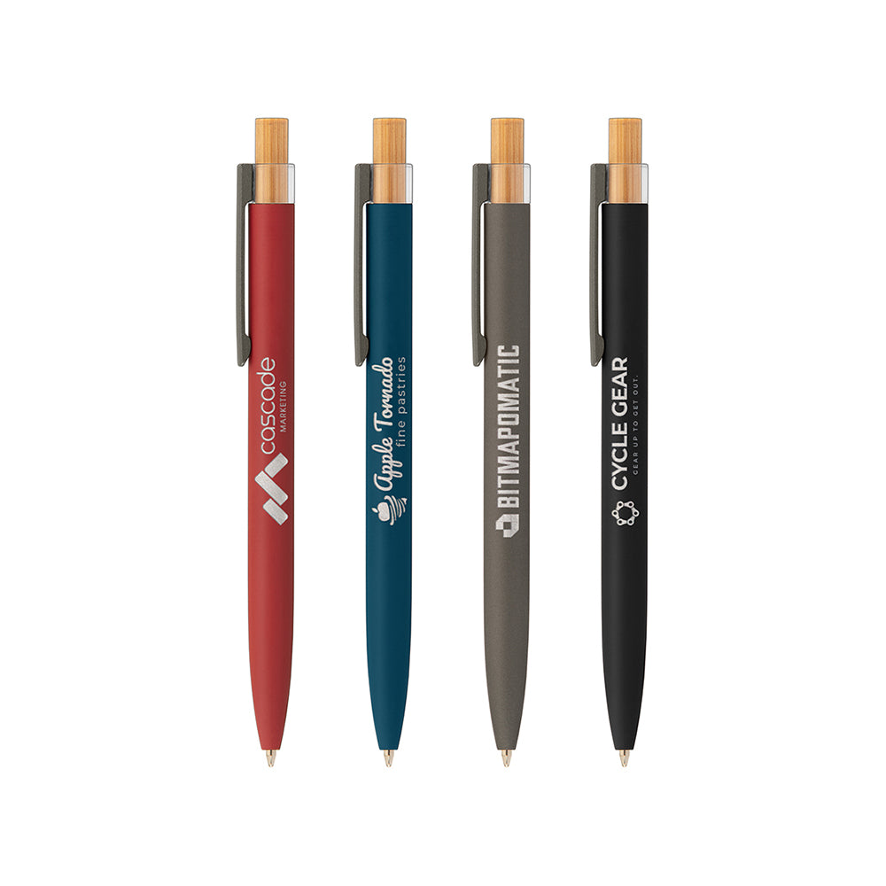 This Recycled Aluminum Pen is a stylish and sustainable metal pen. Its sleek, modern design includes a barrel made with recycled aluminum, accented by a renewable bamboo plunger, gunmetal stainless steel clip, and clear rPET recycled plastic surround.